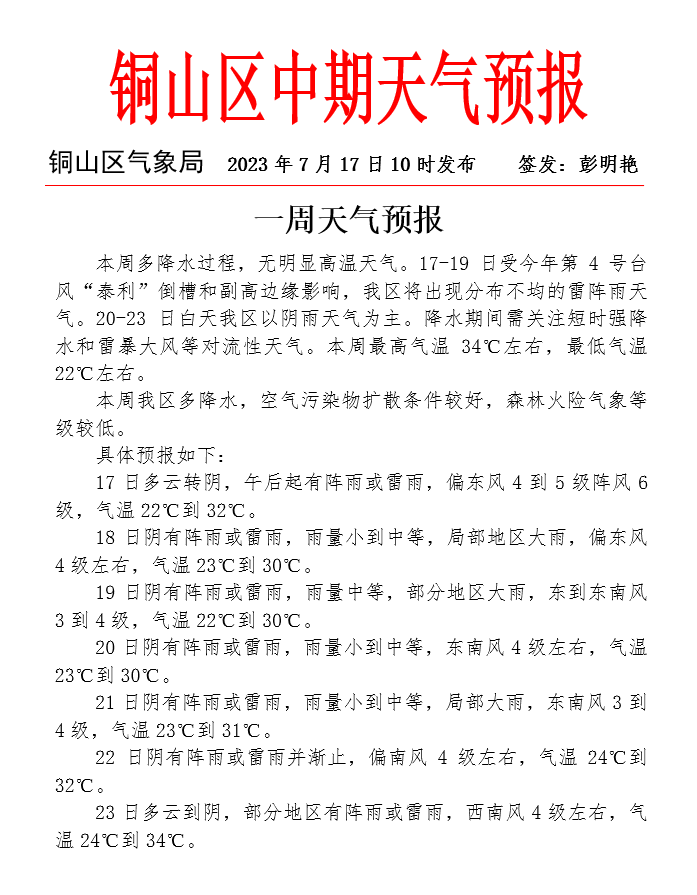 17日,多云转阴,午后起有阵雨或雷雨,偏东风4到5级阵风6级,气温22℃到32℃。