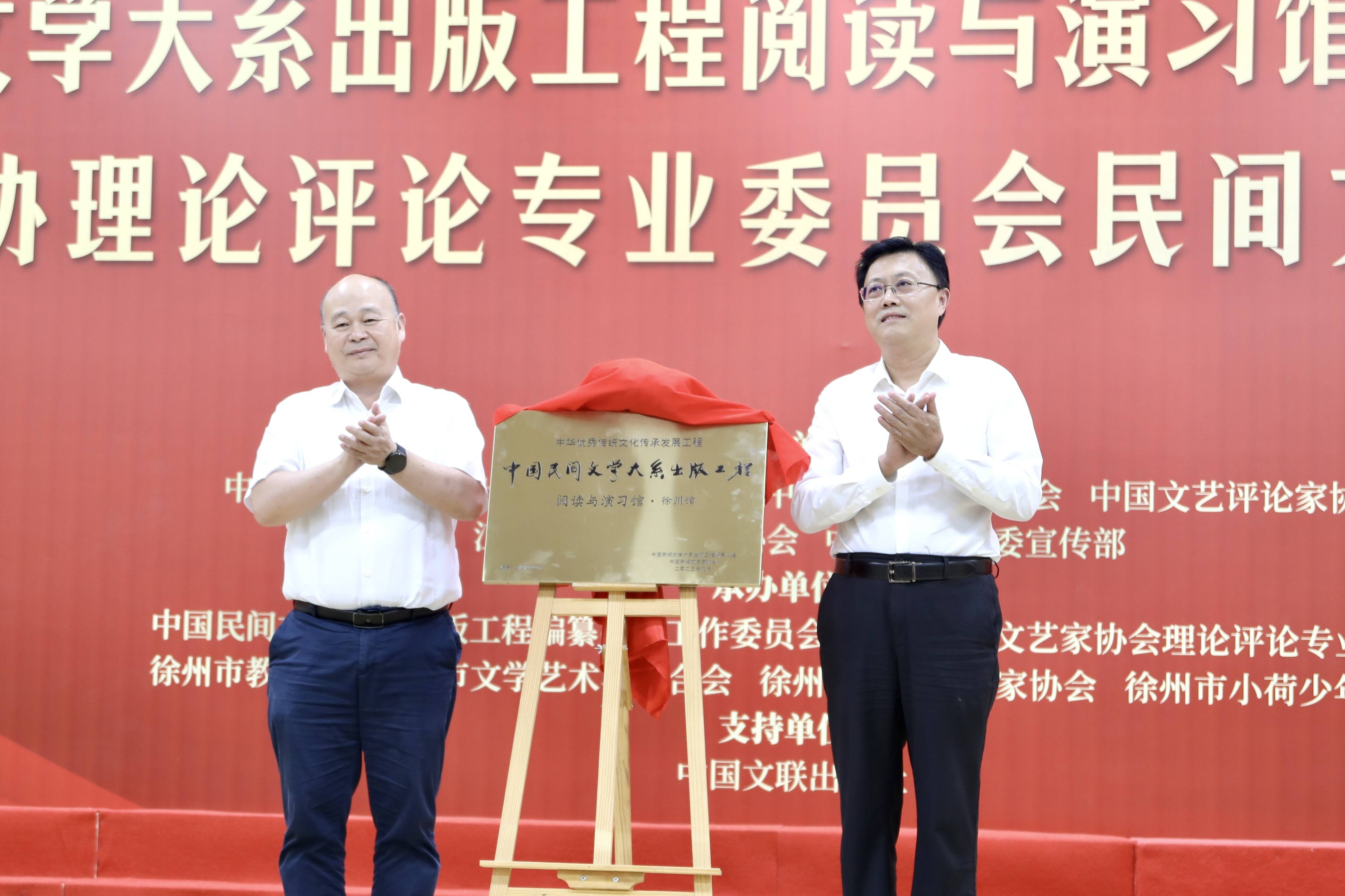 ▲中国民协分党组书记、驻会副主席、秘书长邱运华,市人民政府党组成员、副市长吴卫东为中国民间文学大系出版工程阅读与演习馆·徐州馆揭牌。