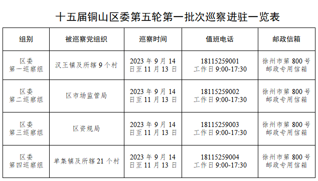 为进一步加强党的领导,强化各级党组织管党治党的政治责任,推进全面从严治党向基层延伸,按照区委统一部署和区委巡察工作领导小组安排,十五届区委第五轮巡察采取压茬推进方式,分两个批次进行。第一批次定于2023年9月14日至11月13日,对汉王镇、单集镇、区市场监管局、区资规局等4家党组织进行巡察,对以上2个镇所辖的30个村党组织采用“镇村一体巡”形式进行巡察,同时开展意识形态专项检查。
