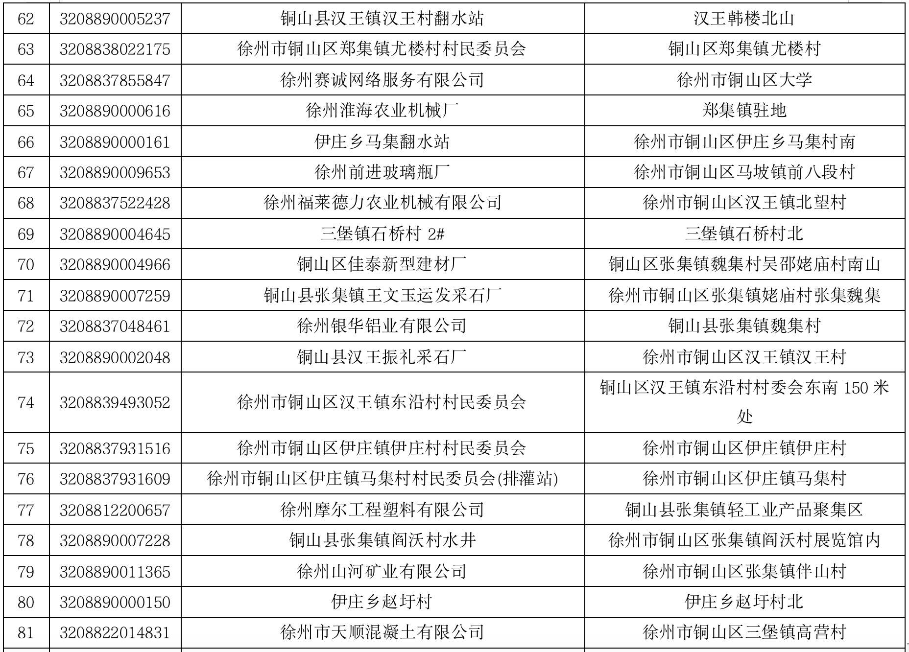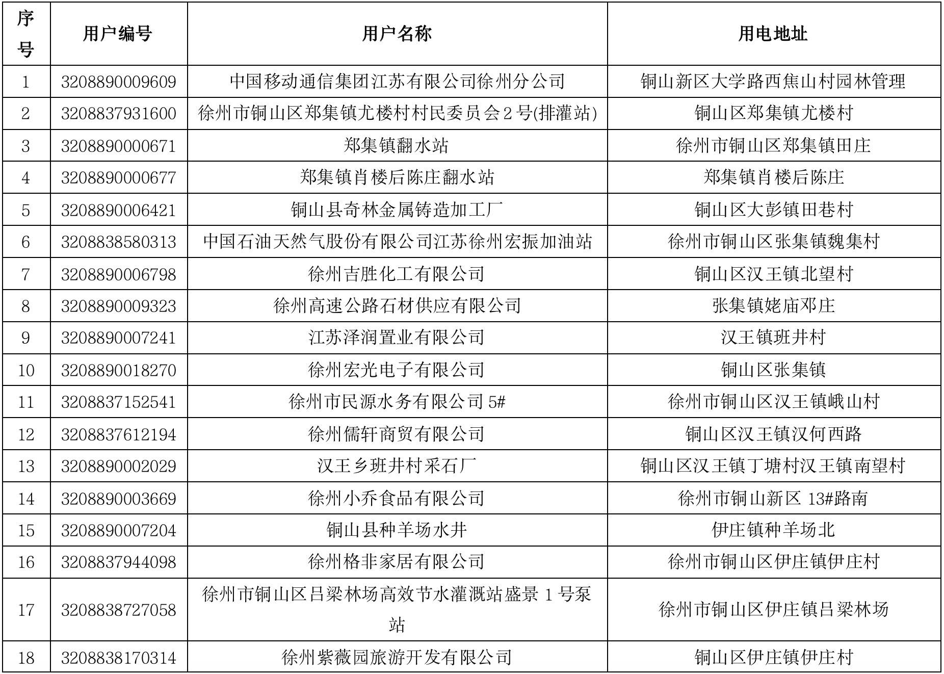 由于近年来铜山地区经济结构调整、环境治理要求不断提高等,存在部分高压客户长期不用电情况。此类用户不仅占用了公共资源影响城市市政面貌,且高压接头未解导致用户线路侧带电、极易造成人身触电伤亡事件。为规范电力设施使用,提高电网资源利用率,经国网江苏省电力有限公司徐州市铜山区供电分公司核实,存在以下用户连续六个月以上无用电行为。根据《供电营业规则》、苏电营2018(151)号文件规定:用户在每一日历年内累计暂停时间不得超过6个月(以户为单位)。全容量暂停到期后,如确实无法联系到用户,由用电检查员现场拍照后内部报办非永久性减容2年。全容量非永久性减容超过2年的,如确实无法联系到用户,由用电检查员现场拍照后内部报办销户处理。现将用户清单公告如下: