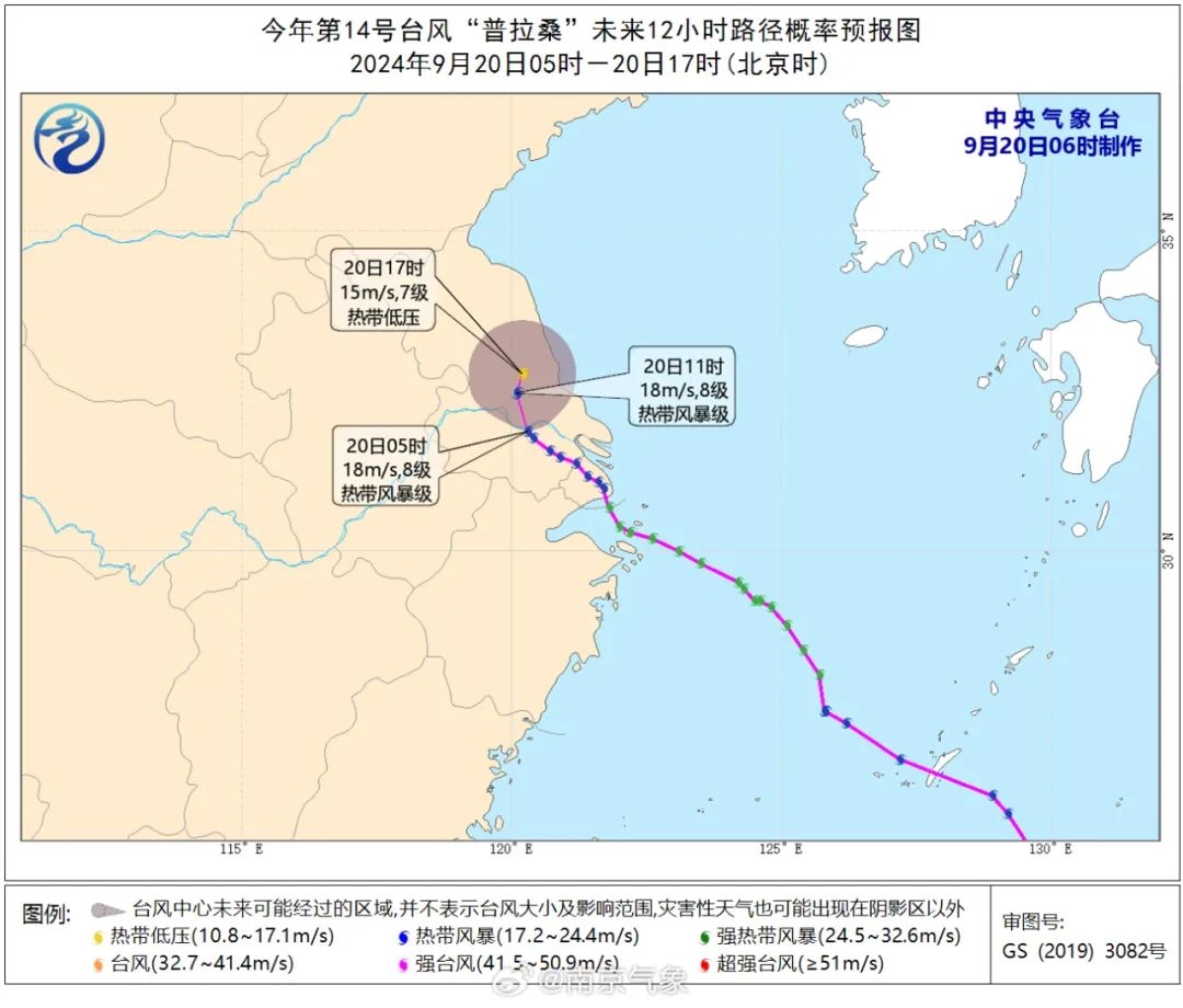今年第14号台风“普拉桑”(热带风暴级)的中心今天(20日)06时位于江苏省江阴市境内,中心附近最大风力8级(18米/秒)。预计“普拉桑”将以每小时10公里左右的速度向偏北方向移动,强度逐渐减弱。