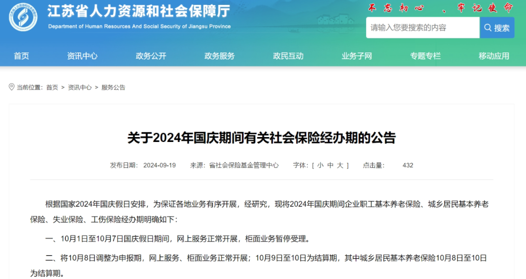 根据国家2024年国庆假日安排,为保证各地业务有序开展,经研究,现将2024年国庆期间企业职工基本养老保险、城乡居民基本养老保险、失业保险、工伤保险经办期明确如下: